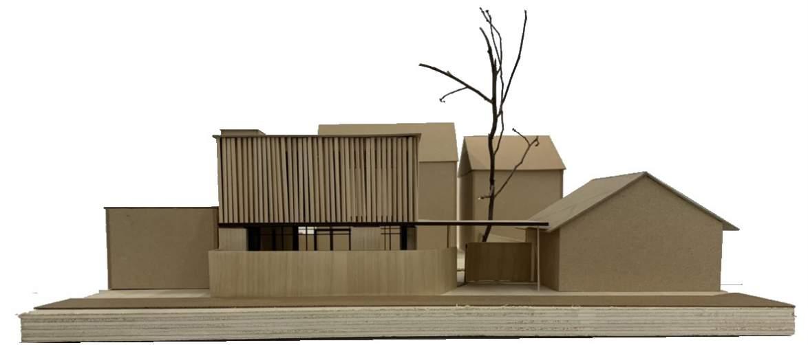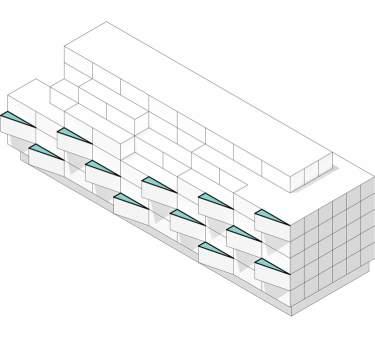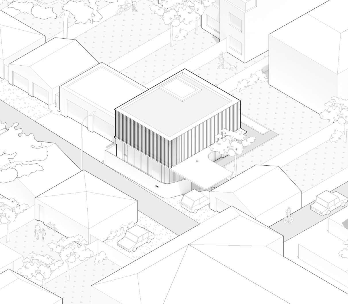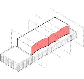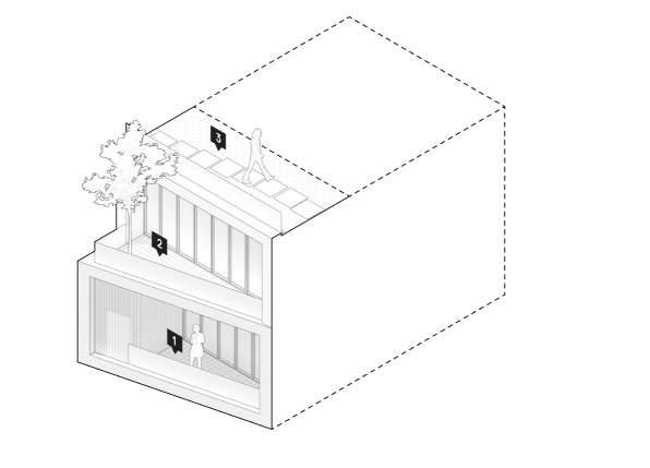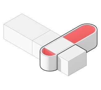 A rectangular massing is disjoined at the centre to create two distinct programmatic areas.