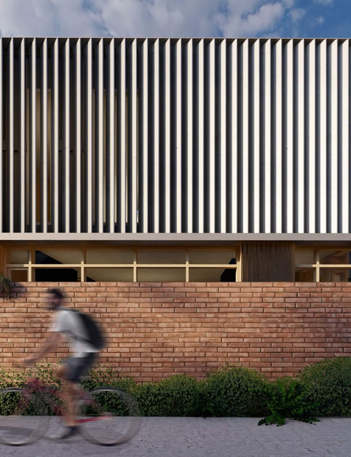 The second floor facade allows for light to permeate while maintaining privacy.