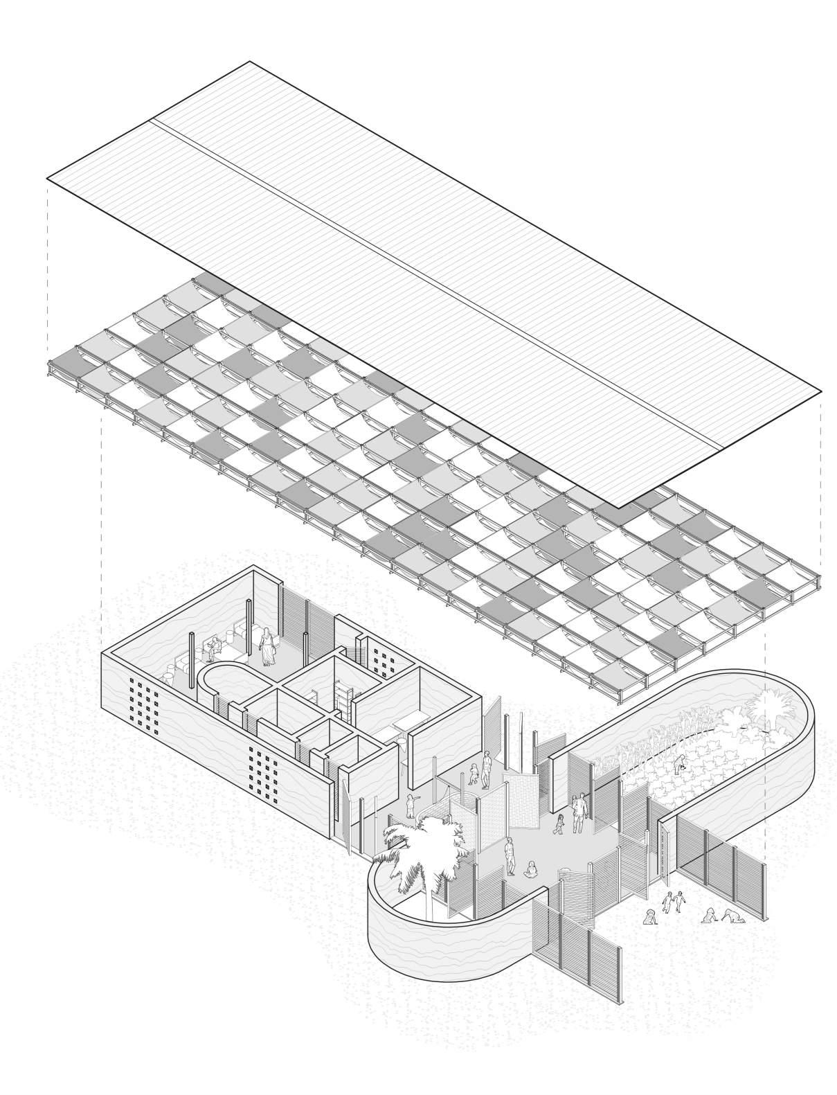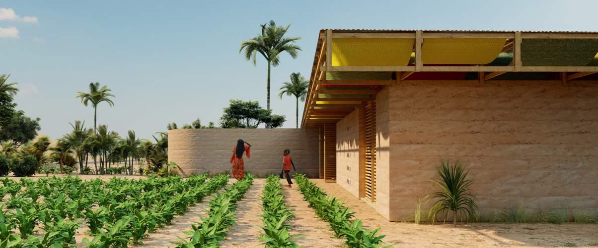 The interjecting courtyard walls create a pocket of defined exterior space which is utilized for agriculture. This acts as an additional source of food for the children who use this space. The function of the entire building is to harmoniously organize the programming into a form which enhances the potential to educate and provide food security to the youth of Simbandi and the surrounding area.