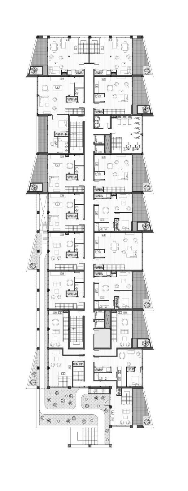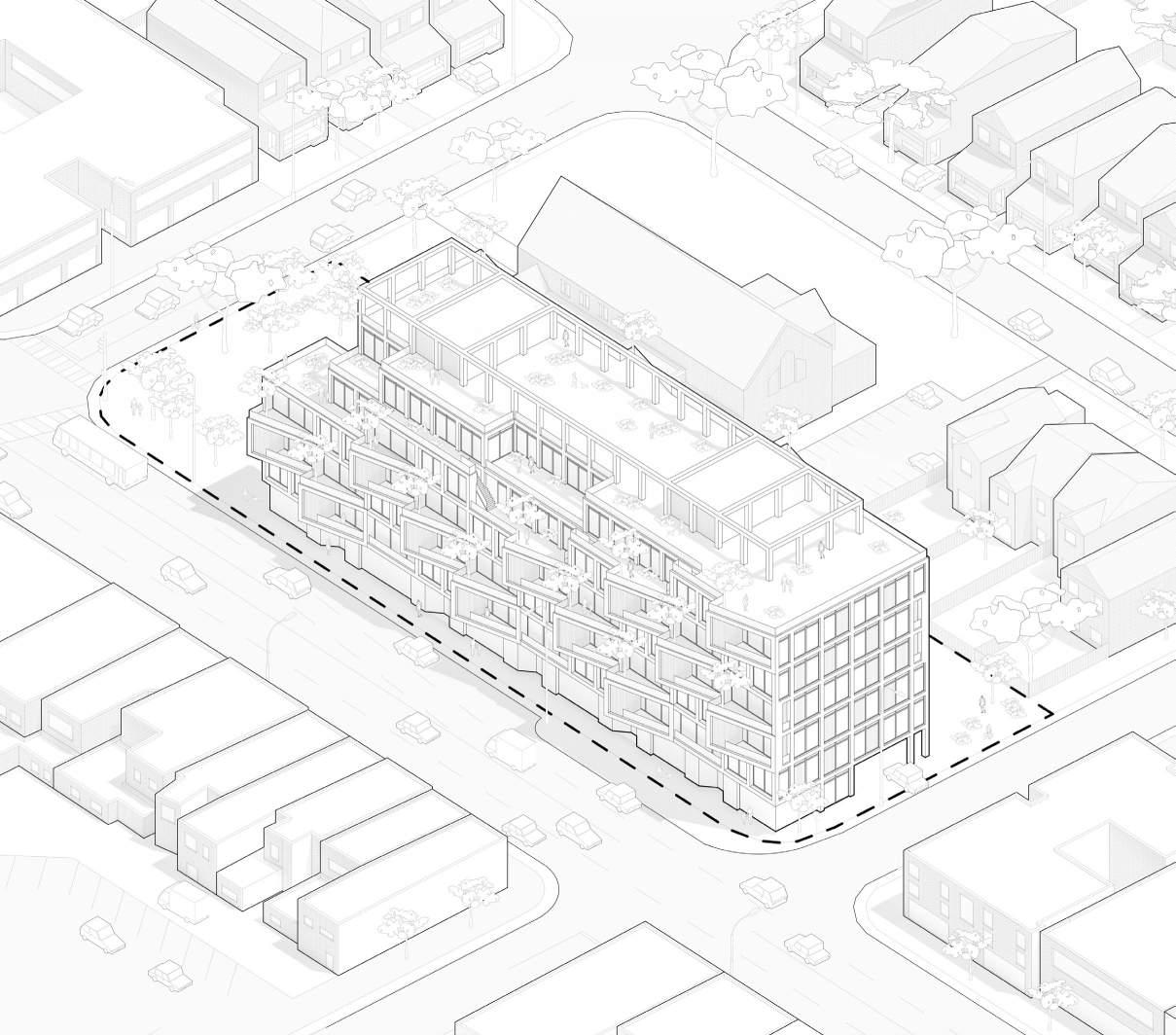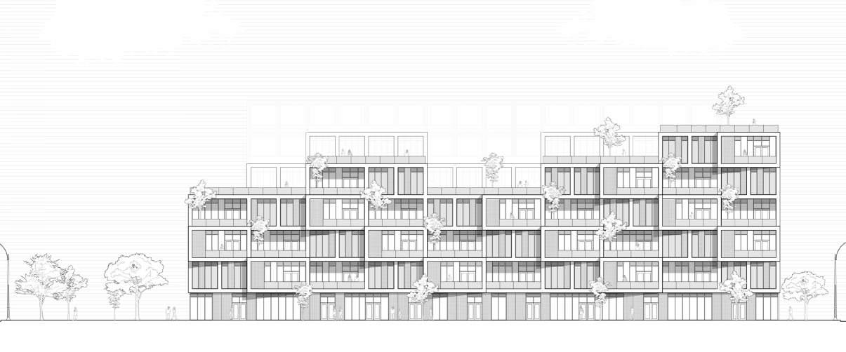 This midrise building situated in Bloor West Village strives to maintain the existing character of the neighbourhood through a reinterpretation of the existing built context within a midrise form factor.