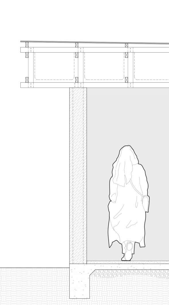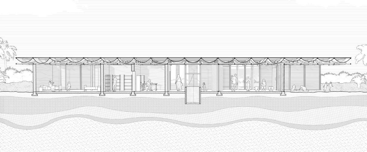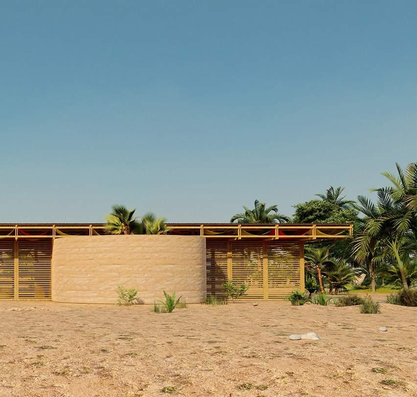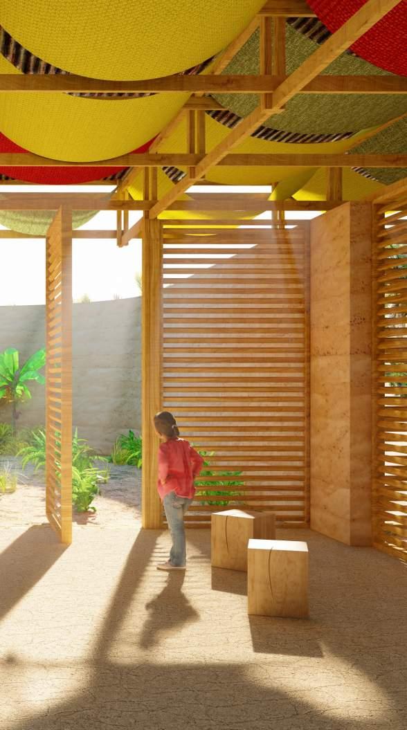 A monolithic form of laterite earth rests upon the ground, with intermittent wooden screens which invite users into the space within. The central entrance opens to a foyer with a well which acts to benefit the entire community, and welcomes all members of the area to participate in the function of this building . The foyer acts as a threshold between programming, dividing the private family spaces from the more public interactive learning spaces.