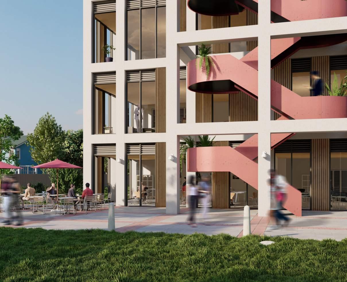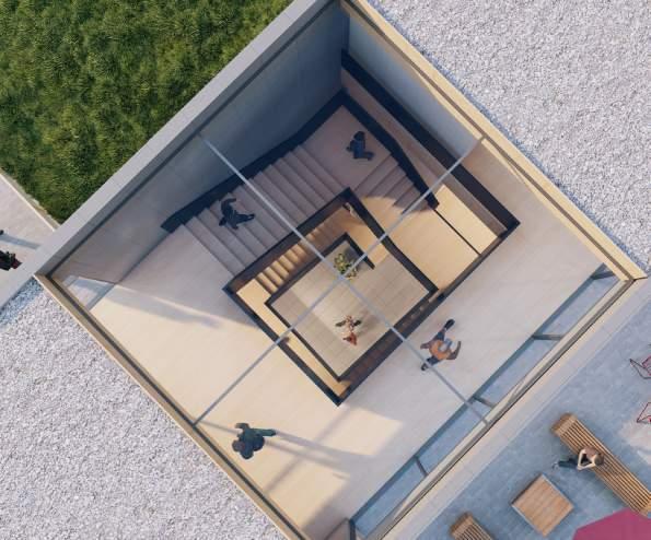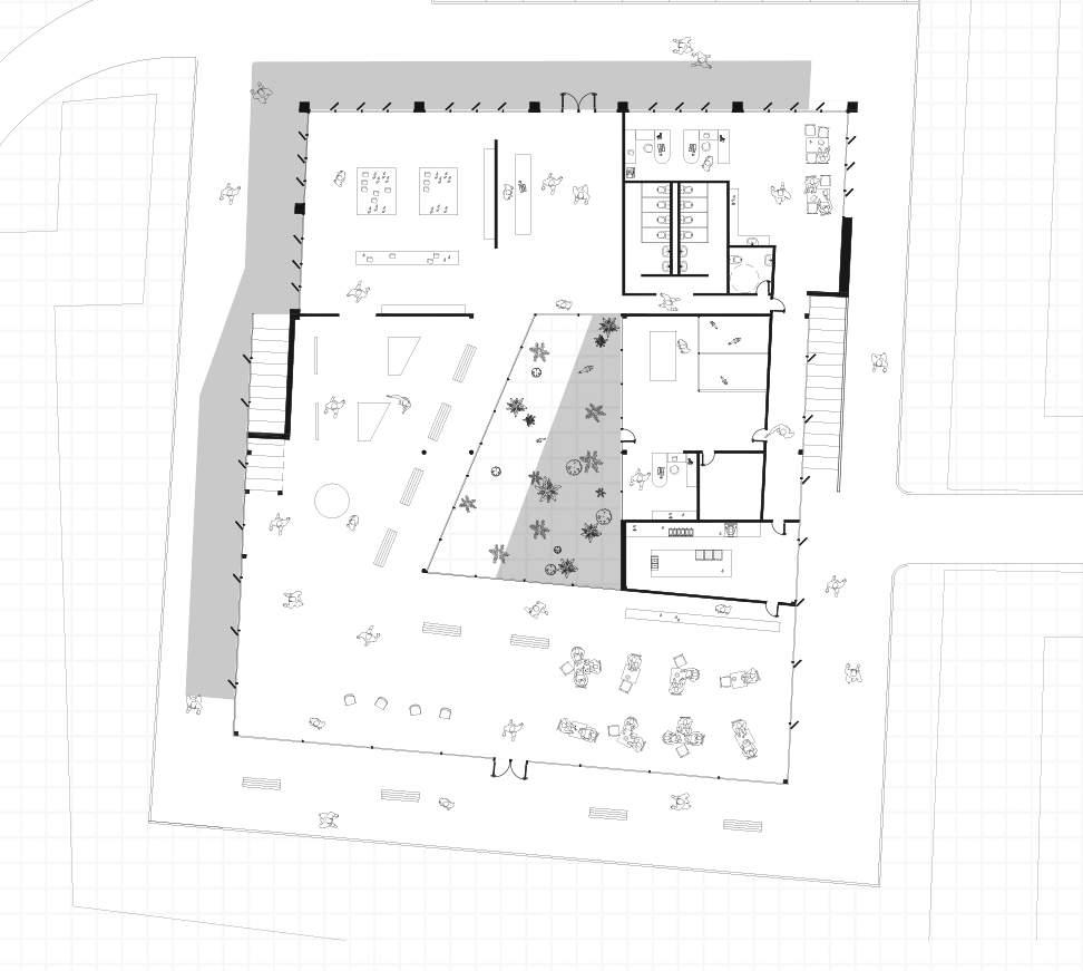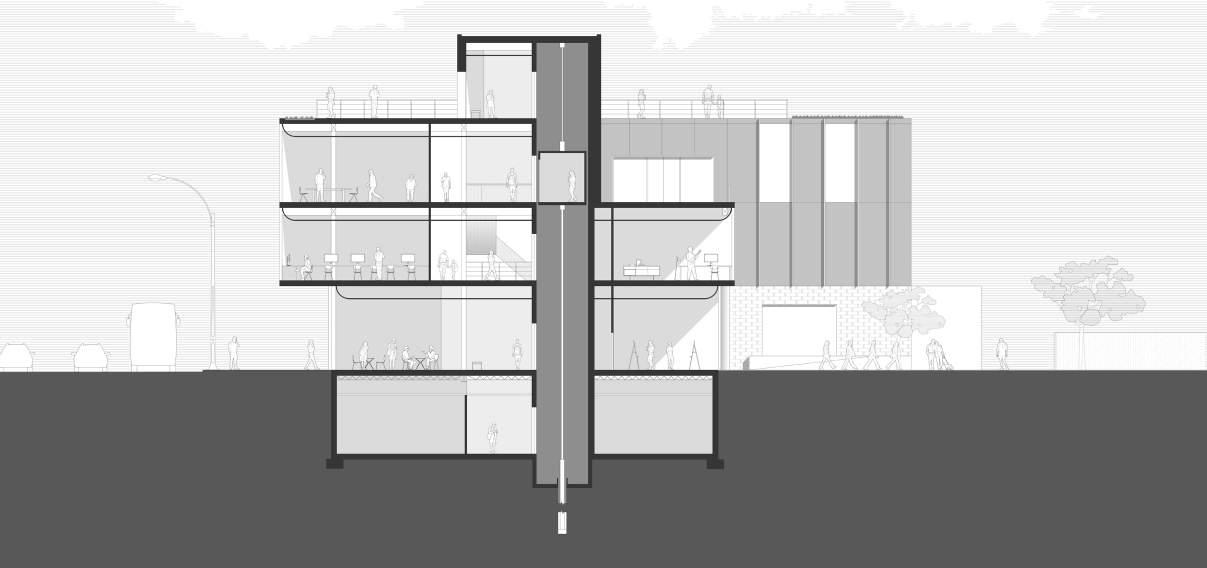 Carving the form using the former bus platforms as guiding line to create community spaces on multiple levels.