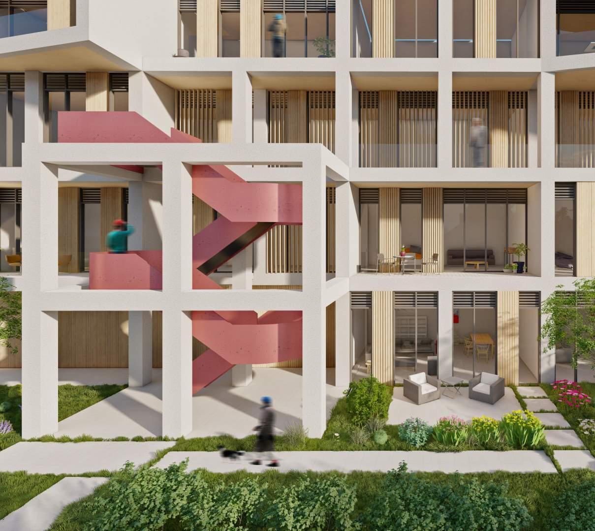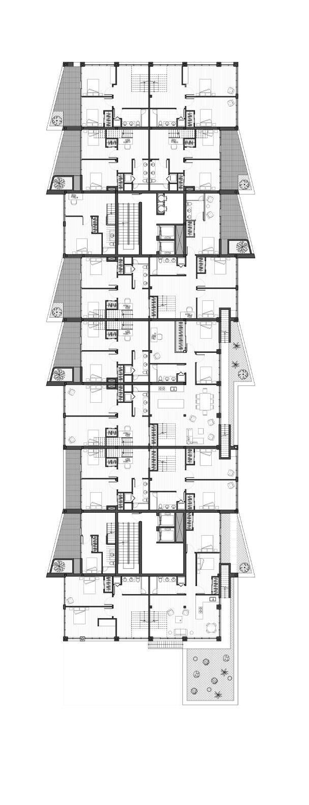 2. Elevated ‘front yards’ with trees are provided to each unit.