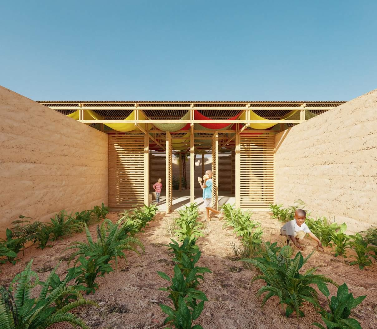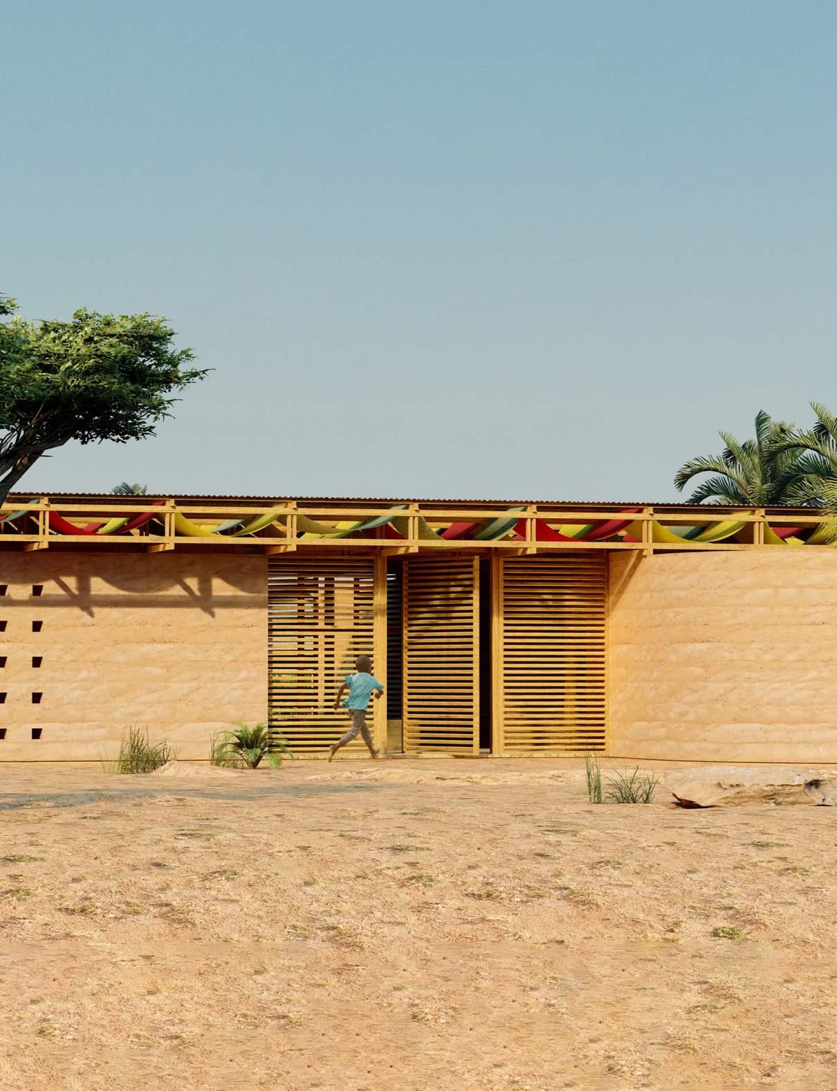 The Simbandi Children’s House nestles into the Senegalese landscape, providing interactive spaces and programming to promote food security and wellness for the local children. The design carefully establishes a relationship with the site, visually reflecting the palette of natural features and materials that define the environment around it.