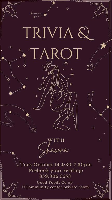 JoinusthesecondTuesdayof eachmonthforTriviainthecafe (beginsat5:30pmandTarot readingsinthecommunityroom (beginsat4:30pm)