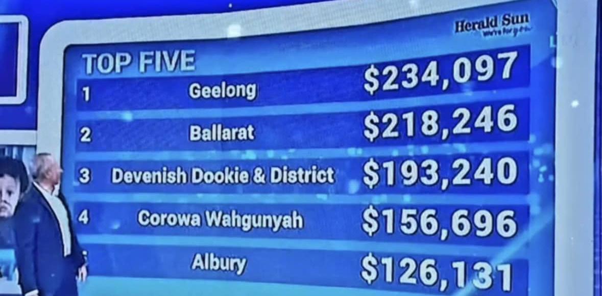 The hardworking team from Devenish, Dookie and District created raffles, held yabby races, barefoot bowls, golf days, a lamb drive and a music day in order to reach their incredible fundraising result this year.