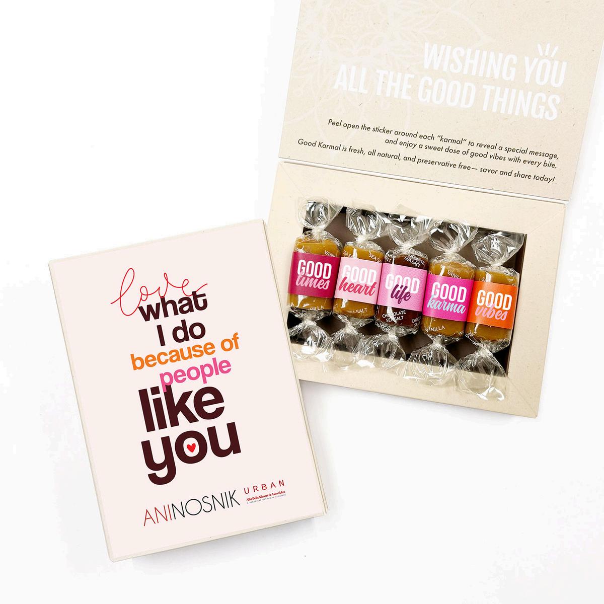 Iordered appreciationgifts formystaffand consultants.Igota phonecallfromeach personextollingthe amazinglygreat flavorand thoughtfulness.In contrast,Isentallof myclientsacurated giftsetofwineand heardnothing.Next yeareveryonegets GoodKarmal!