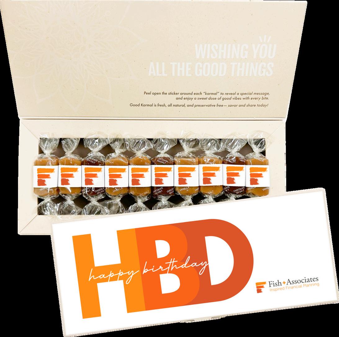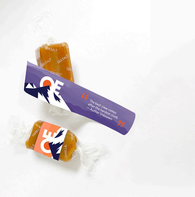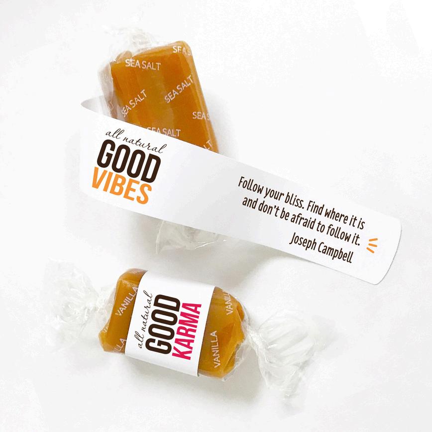 Each Good Karmal caramel comes in a fullcolor, custom-designed wrapper featuring a logo or graphic on the front and a quote or message inside. You can choose from our list of favorite positive quotations, or provide your own quotes or messaging.