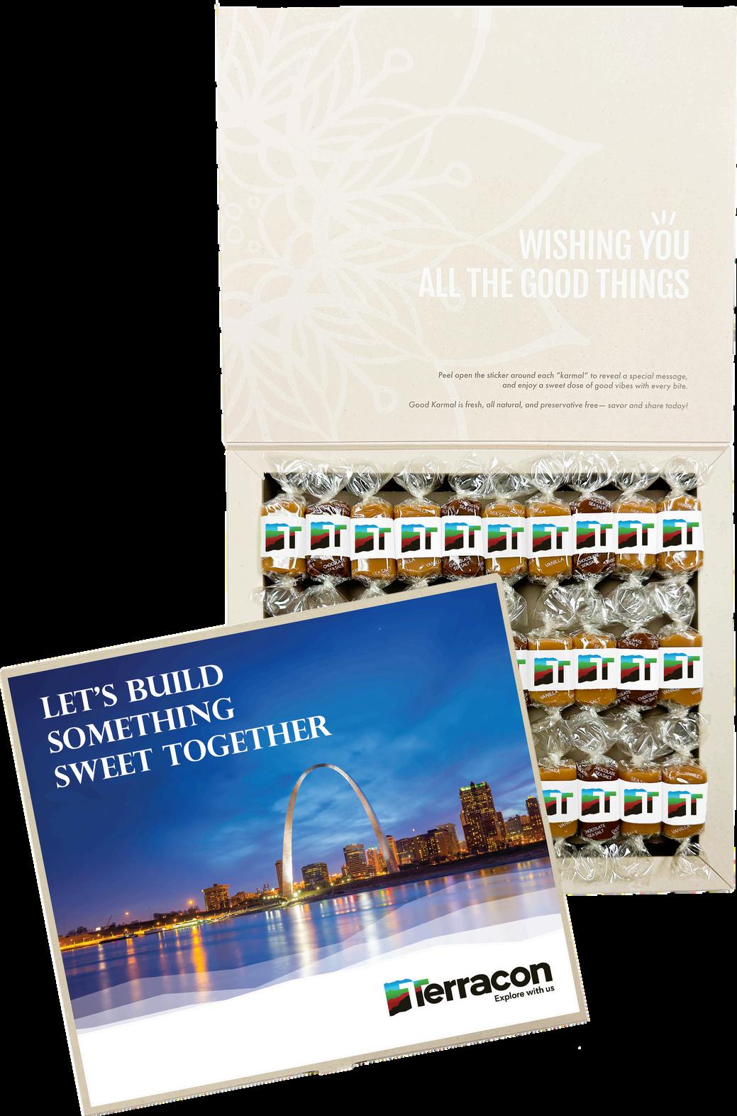 Each Good Karmal caramel comes in a full-color, customizable wrapper. With space for a logo or graphic on the front and a custom quote or message tucked inside, this wrapper is an entirely blank slate to showcase your brand.