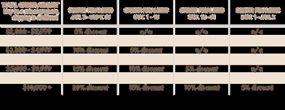 We offer volume discounts as our way of saying thank you for your business! You can save between 5% and 20% on the total product ordered for orders of $2,000+. Please see the chart below for deadlines and specifics!