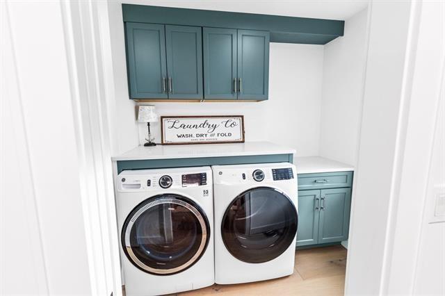 Laundry is tucked in the back hallway just off the primary suite and conveniently located in the hallway near the garage entrance.