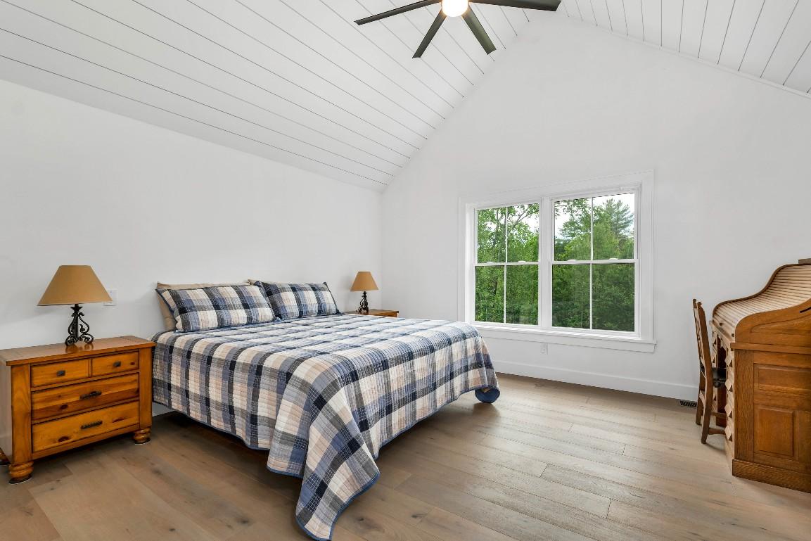 The east (front) bedroom has a great view of the front yard and a vaulted ceiling.