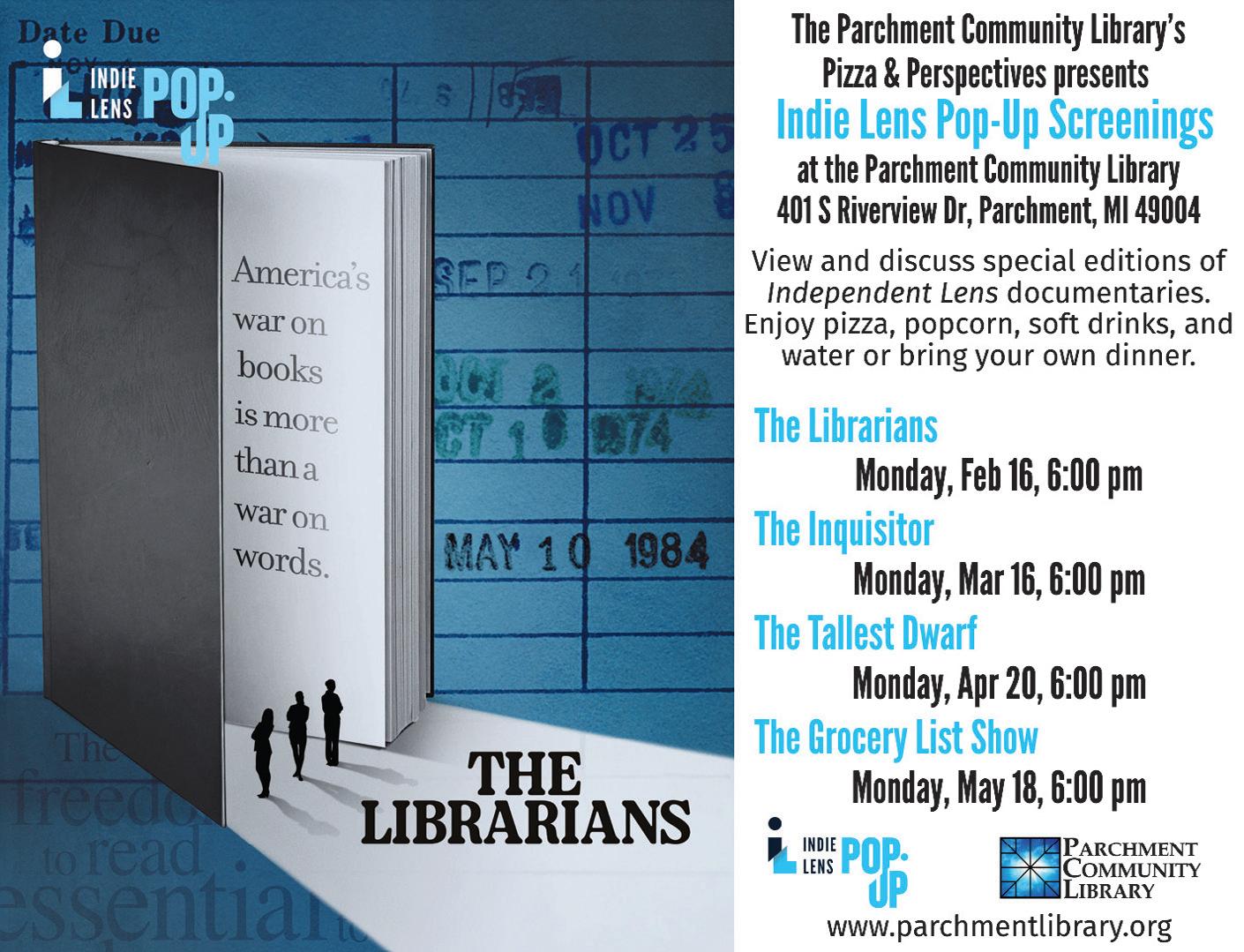 Monday, February 16 Pizza & Perspectives: Indie Lens PopUp, watch & discuss documentary The Librarians, 6pm, Parchment Library