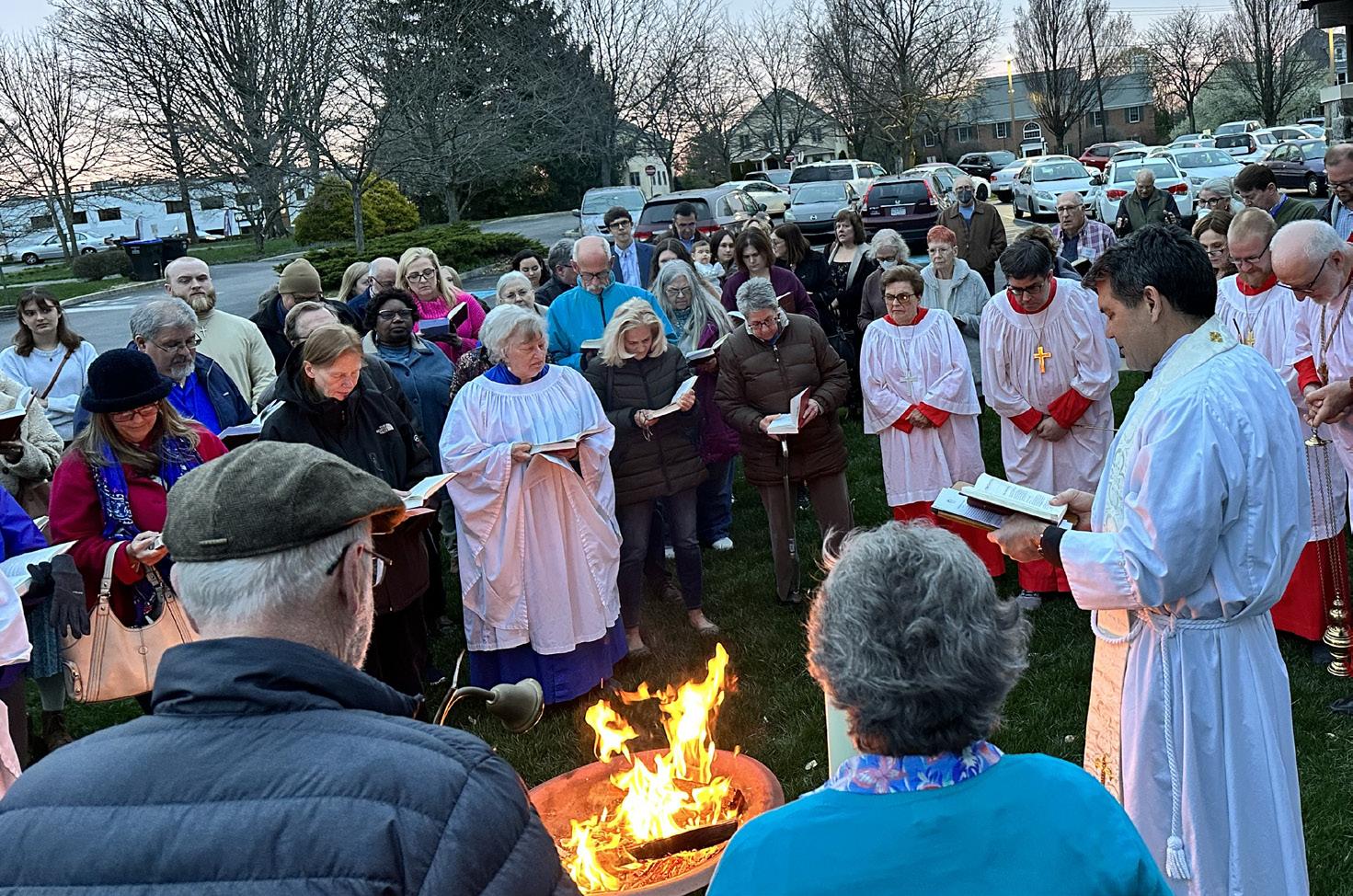 One of the strangest things I have ever done at our church is stand beneath the portico outside our atrium in a crowd huddled together against the cold, dark rain until—suddenly—the flames of a small bonfire illuminate the embroidered vestments of our clergy, the filmy dresses of liturgical dancers, and the starry eyes of ordinary worshipers who no longer seem ordinary at all. I have never joined the Easter Vigil on Holy Saturday at The Church of the Good Samaritan without wondering what it all must look like to a passing motorist on Lancaster Avenue. I like to imagine that our peculiar, firelit procession unsettles them and prompts thoughts like these: I assumed church was tame and polite, but maybe it’s something wilder? Maybe it’s something stranger? Fire, water, dance, and voices raised in prayer or song: it seems to me more like an image painted on an ancient Greek or Roman vessel than a Saturday night in Paoli, Pennsylvania, in the year 2025. And yet, if the Easter Eve liturgy we offer each year seems out of step with contemporary American suburban life, then this is simply one more sign of the wonderfully strange heart that beats in The Church of the Good Samaritan.