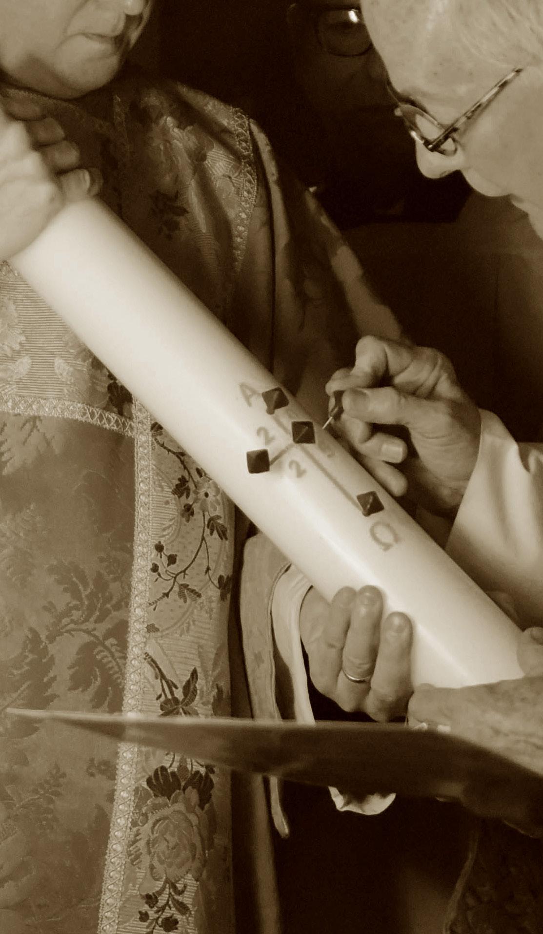 feeling that we have now sat at table with Jesus and his disciples? And yet, in one of the strangest traditions of a strange service in a strange church, during the Easter Vigil the current year is meticulously, prayerfully carved into the Paschal candle along with the letters Alpha and Omega (beginning and end). With that deliberate noting of the current year, I become fully aware of the present moment and know with certainty that Jesus Christ is alive and with us right now. I have not stumbled into some ancient, possibly pagan ritual. What is happening is happening now, Christ is alive today, and every year brings us nearer to the fulfillment of history and the glorious appearance of our Savior and King.