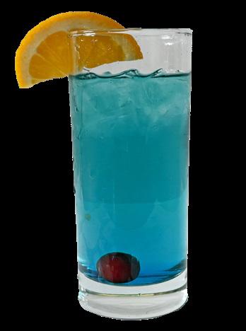 Ginger Ale, Blue Curaçao, and Lime Juice garnished with an Orange Slice and Cherry