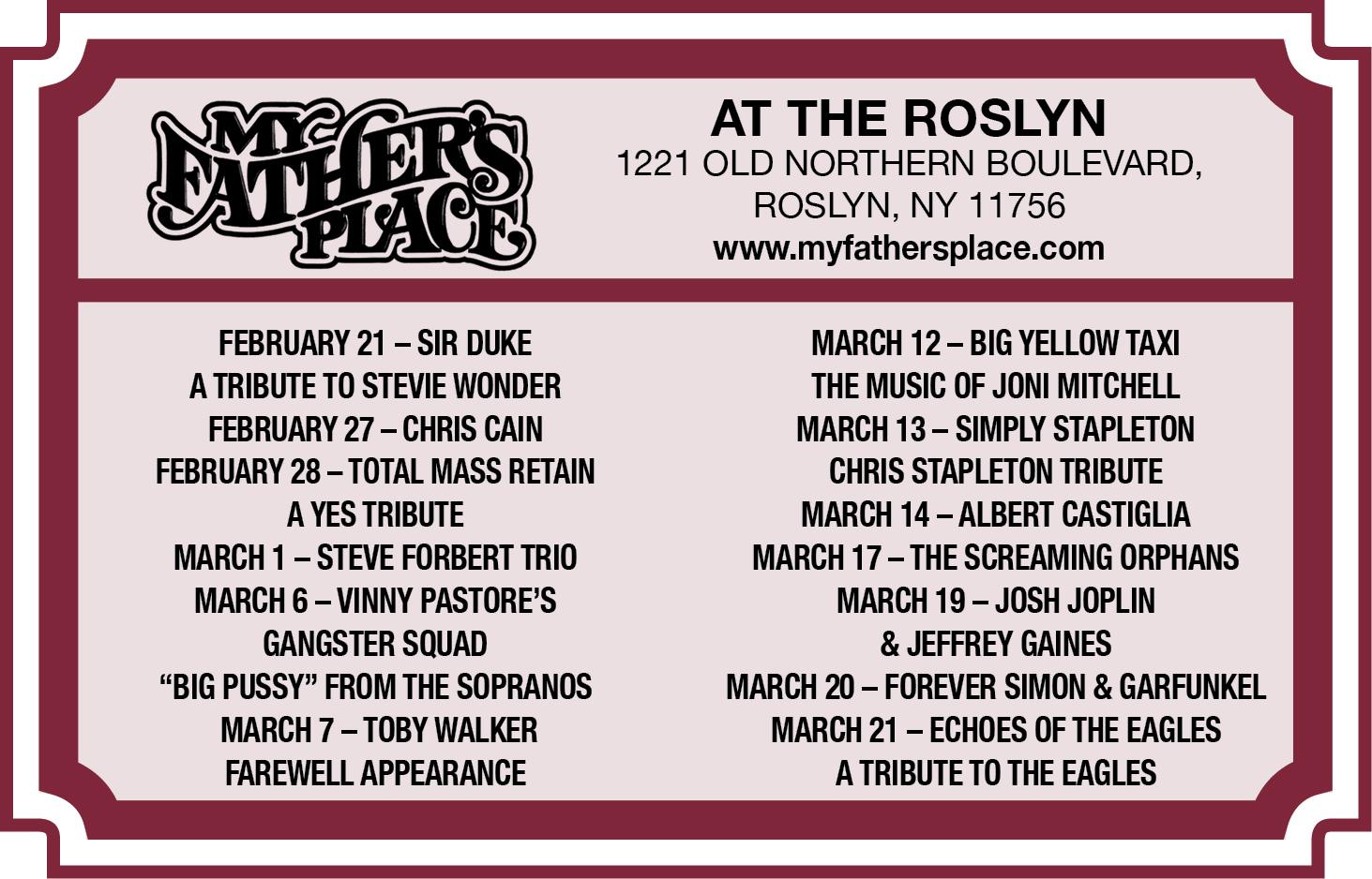 March 15 at The Landmark on Main Street 232 Main Street Port Washington (516) 767-6444 or email boxoffice@landmarkonmainstreet.org
