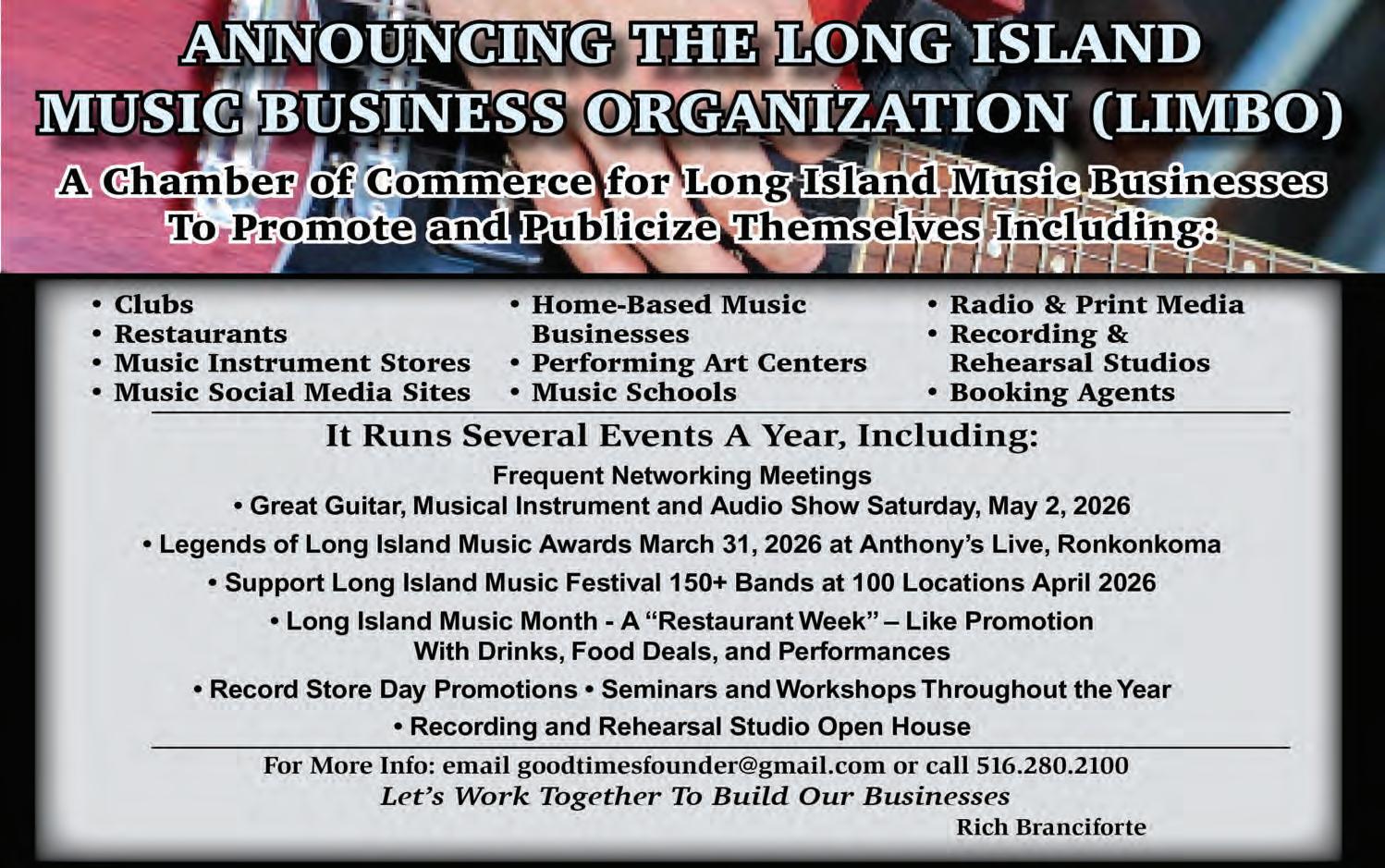 LIMBO was set up 2 years ago as a Chamber of Commerce to promote Long Island Music Businesses (response has been fantastic) and the music community. It also runs the highly successful Great Guitar, Musical Instrument and Audio Show, May 2nd.