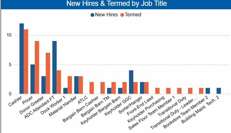 • Cashiers, Pricers, Donor Greeters still have the highest turnover