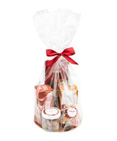 Ikoniska julprodukter noga utvalda för att passa varandra i både utseende och smak. Gåvorna slås in i ett cellofanknyte eller en trälåda vilket förhöjer julkänslan, deluxe.
