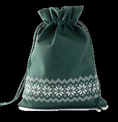Ett juligt geometriskt mönster av snöflingor pryder dessa röda och gröna säckar. Välj mellan tre olika storlekar och om de ska fyllas med vår goda favoritblandning eller lyxiga pralinmix. För en personligare gåva kan ni få er julhälsning tryckt på säcken eller på ett fint julkort.