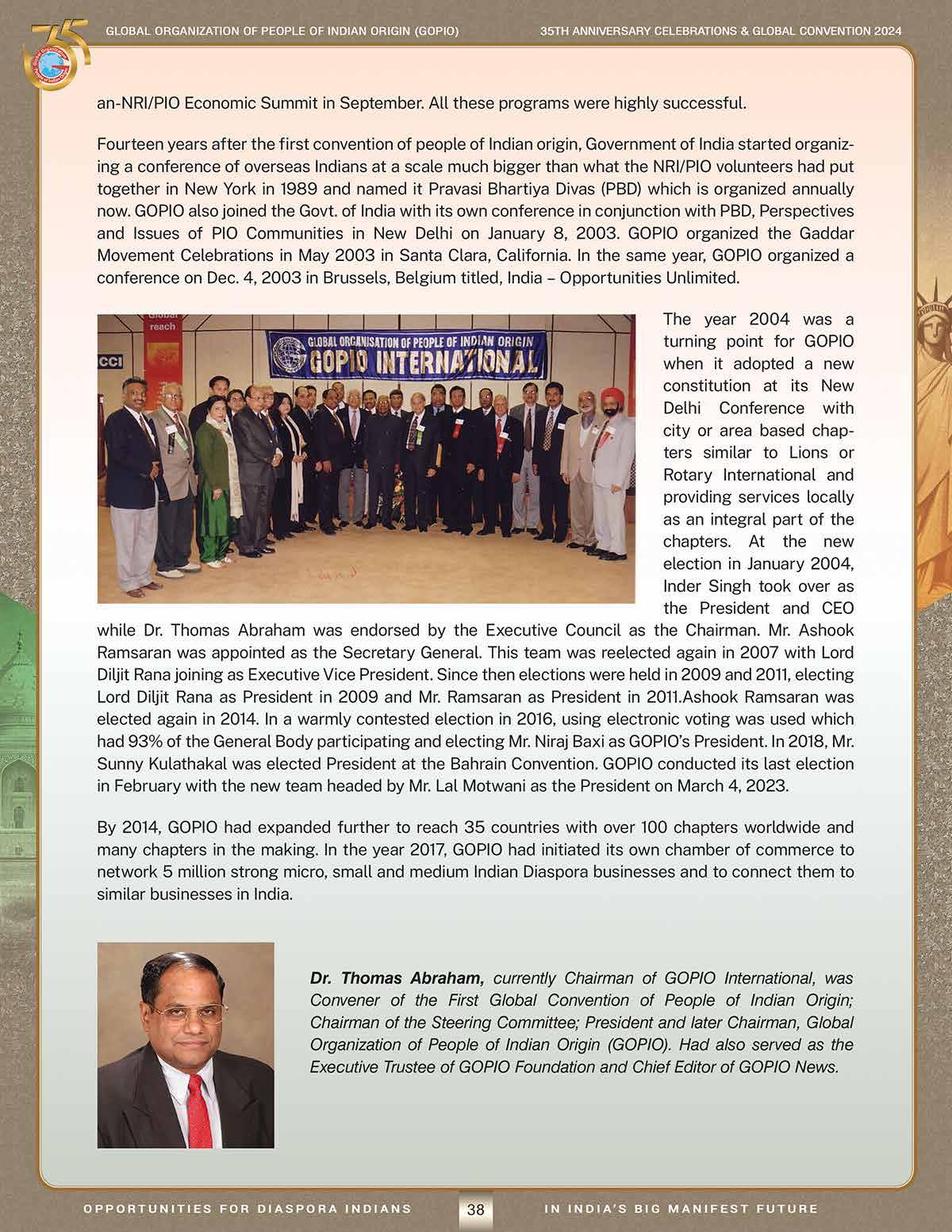 The Global Organization of People of Indian Origin (GOPIO) celebrated its 35th Anniversary from April 26-28, 2024, at the Royal Albert Palace in Fords, New Jersey. The convention, themed “Opportunities for Diaspora Indians in India’s Big Manifest Future,” aimed to explore how the Indian diaspora can contribute to India's growth. Notably, the General Body passed four resolutions, including a call for full dual nationality for Overseas Indian Citizens (OCI) cardholders, and reelected Dr. Thomas Abraham as Chairman.