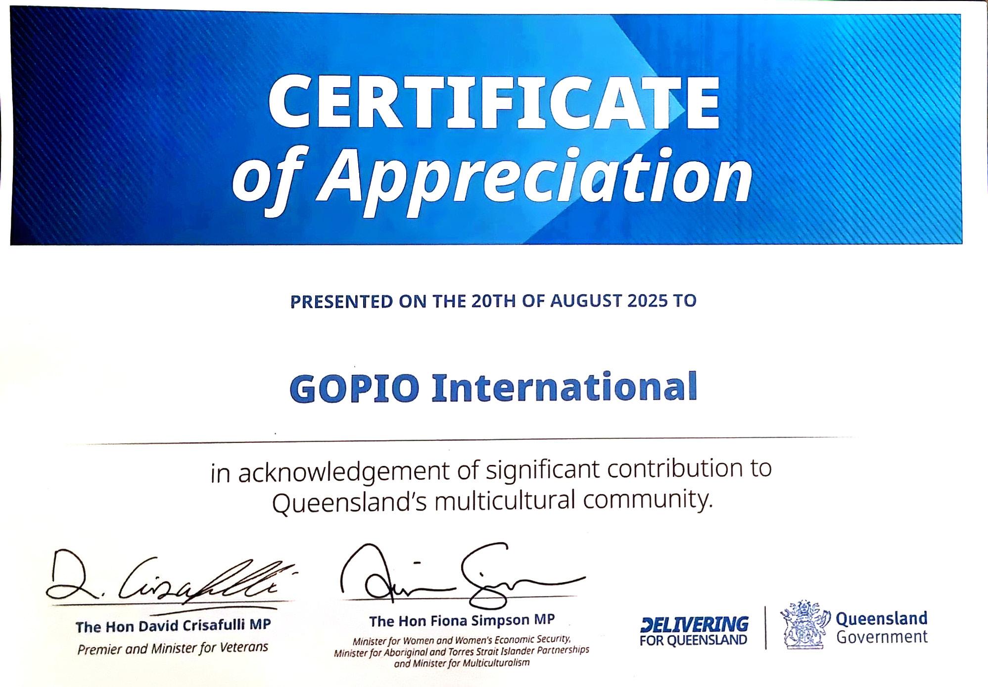 collaboration, and the values that make Queensland’s multicultural landscape a strength. The event highlighted not only the achievements of GOPIO International, GOPIO Queensland, and GOPIO Gold Coast, but also the broader, ongoing work of countless community organizations contributing to Queensland’s dynamic economy, culture, and social harmony.