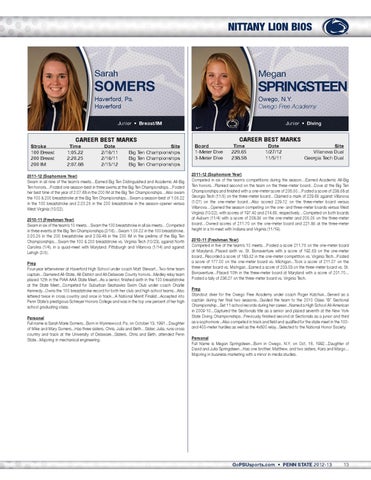 2011-12 (Sophomore Year) Swam in all nine of the team’s meets…Earned Big Ten Distinguished and Academic All-Big Ten honors…Posted one season-best in three swims at the Big Ten Championships…Posted her best time of the year of 2:07.68 in the 200 IM at the Big Ten Championships…Also swam the 100 & 200 breaststroke at the Big Ten Championships…Swam a season-best of 1:05.22 in the 100 breaststroke and 2:20.25 in the 200 breaststroke in the season-opener versus West Virginia (10/22). 2010-11 (Freshman Year) Swam in six of the team’s 10 meets…Swam the 100 breaststroke in all six meets…Competed in three events at the Big Ten Championships (2/16)…Swam 1:05.22 in the 100 breaststroke, 2:20.25 in the 200 breaststroke and 2:09.48 in the 200 IM in the prelims of the Big Ten Championships…Swam the 100 & 200 breaststroke vs. Virginia Tech (10/23), against North Carolina (1/4), in a quad-meet with Maryland, Pittsburgh and Villanova (1/14) and against Lehigh (2/5). Prep Four-year letterwinner at Haverford High School under coach Matt Stewart...Two-time team captain...Garnered All-State, All-District and All-Delaware County honors...Medley relay team placed 12th in the PIAA AAA State Meet...As a senior, finished sixth in the 100 breaststroke at the State Meet...Competed for Suburban Seahawks Swim Club under coach Charlie Kennedy...Owns the 100 breaststroke record for both her club and high school teams...Also lettered twice in cross country and once in track...A National Merrit Finalist...Accepted into Penn State’s prestigious Schreyer Honors College and was in the top one percent of her high school graduating class. Personal Full name is Sarah Marie Somers...Born in Wynnewood, Pa. on October 13, 1991...Daughter of Mike and Mary Somers...Has three sisters, Chris, Julia and Beth…Sister, Julia, runs cross country and track at the University of Delaware...Sisters, Chris and Beth, attended Penn State...Majoring in mechanical engineering.