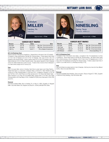 2011-12 (Freshman Year) Swam in all nine of the team’s competitions…Ranked third on the team in the 100 butterfly… Competed in three preliminaries at the Big Ten Championships…Posted season-best times of 2.18 in the 50 freestyle and 52.00 in the 100 freestyle…Also swan 56.18 in the 100 butterfly at the championships…Swam a season-best 56.12 in the 100 butterfly at the Ohio State Invitational (12/2-4) to finish 1seventh overall…Also placed 1seventh in the 50 freestyle at the Ohio State Invitational in a time of 23.52…Posted a time of 23.92 in the 50 freestyle in a tri-meet versus Lehigh and St. Francis (2/4).