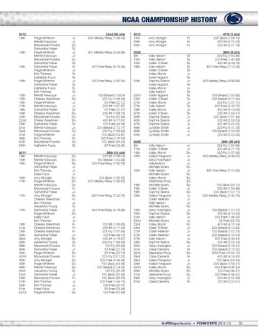 2008 29th (26 pts) 6th Kelly Nelson Jr. 200 Fly (1:55.86) 11th Kaitlin O’Brien Jr. 400 IM (4:11.15) 13th Kailey Morris So. 200 Fly (1:57.56) 16th Kaitlyn Ferguson Jr. 400 Medley Relay (3:38.62) Abby Hoisington Jr. KellyNelson Jr. Michelle Myers So. 16th Kelly Nelson Jr. 800 Free Relay (7:14.25) Michelle Myers So. Kailey Morris So. Stephanie Roop So. 18th Michelle Myers So. 100 Back (54.10) 18th Kaitlin O’Brien Jr. 200 IM (1:58.88) 18th Daphne Skelos So. 200 Back (1:57.11) 19th Kaitlyn Ferguson Jr. 200 Medley Relay (1:40.79) Caitlin Meehan Jr. Kelly Nelson Jr. Michelle Myers So. 19th Abby Hoisington Jr. 100 Breast (1:01.75) 19th Daphne Skelos So. 400 IM (4:14.53) 20th Kelly Nelson Jr. 200 Free (1:46.55) 22nd Michelle Myers Jr. 50 Free (22.75) 23rd Kailey Morris So. 400 IM (4:15.04) 23rd Kaitlin O’Brien Jr. 200 Breast (2:14.30) 27th Caitlin Meehan Jr. 100 Breast (1:02.75) 27th Caitlin Meehan Jr. 200 Breast (2:15.04) 27th Kelly Nelson Jr. 500 Free (4:43.54) 28th Daphne Skelos So. 200 IM (2:00.14) 30th Abby Hoisington Jr. 200 Breast (2:15.31) 31st Claire Clemens Sr. 200 Breast (2:15.37) 32nd Stephanie Roop So. 1650 Free (16:52.15) 33rd Claire Clemens Sr. 400 IM (4:19.95) 33rd Kaitlyn Ferguson Jr. 100 Back (55.09) 34th Kaitlyn Ferguson Jr. 200 Back (1:59.41) 42nd Kailey Morris So. 500 Free (4:46.54) 49th Michelle Myers So. 100 Free (49.57) 51st Stephanie Roop So. 500 Free (4:49.62) 58th Abby Hoisington Jr. 200 IM (2:02.33) 61st Claire Clemens Sr. 200 IM (2:02.61)