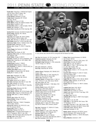 Farrell, Sean; Tampa Bay, G, 1982-86; New England, 1987-89; Denver, 1990-91; Seattle, 1992 Filak, John; Frankford, T, 1927-29 Finney, Shamar; Washington, LB, 2002 Fitzkee, Scott; Philadelphia, WR, 1979-80; San Diego, 1981-82 Flythe, Mark; N.Y. Giants, DT, 1993 Forbes, Marlon; Chicago, DB, 1996-98; Cleveland, 1999 Franco, Brian; Cleveland, K, 1987 Frerotte, Mitch; Buffalo, G, 1987-92; Seattle, 1993-94 Frketich, Len; Pittsburgh, T, 1945 Fusina, Chuck; Tampa Bay, QB, 1979-82; Green Bay, 1986 Gardner, Rich; Tennessee, CB, 2004-05; Seattle 2006 Garrity, Gregg; Pittsburgh, WR, 1983-84; Philadelphia, 1985-89 Gash, Sam; New England, RB, 1992-97; Buffalo, 1998-99; Baltimore, 2000-02; Buffalo, 2003 Gerak, John; Minnesota, G, 1993-96; St. Louis, 1997 Getty, Charlie; Kansas City, T, 1974-82; Green Bay, 1983 Giacomarro, Ralph; Atlanta, P, 1983-85; Denver, 1987 Giannetti, Frank; Indianapolis, DT, 1991 Gilmore, John; Chicago, TE, 2002-07; Tampa Bay, 2008-10 Givens, Reggie; San Francisco, LB, 1998-99; Washington, 2000 Gladys, Gene; New Orleans, LB, 1981 Goganious, Keith; Buffalo, LB, 1992-94; Jacksonville, 1995; Baltimore, 1996 Gould, Robbie; Chicago, K, 2005-10 Graf, Dave; Cleveland, LB, 1975-79; Washington, 1981 Graham, Don; Tampa Bay, LB, 1987; Buffalo, 1988; Washington, 1989 Greeley, Bucky; Carolina, C, 1996-98 Greenshields, Donn; Brooklyn, T, 1932-33 Grier, Roosevelt; N.Y. Giants, DT, 1955-56, 58-62; Los Angeles Rams, 1963-66 Griffiths, Percy (Red); Canton, G, 1921 Guman, Mike; Los Angeles Rams, RB, 1980-88 Gursky, Al; N.Y. Giants, LB, 1963 Haden, Nick; Philadelphia, G/C, 1986 Haines, Hinkey; N.Y. Giants, QB, 1925-28; Staten Island, 1929-31 Hali, Tamba; Kansas City, DE, 2006-10 Hall, Galen; Washington, QB, 1962; N.Y. Jets, 1963 Ham, Jack; Pittsburgh, LB, 1971-82 Hamilton, Harry; N.Y. Jets, Saf, 1984-87; Tampa Bay, 1988-91 Hammonds, Shelly; Minnesota, DB, 1995 Hamas, Steve; Orange, B, 1929 Harris, Franco; Pittsburgh, RB, 1972-83; Seattle, 1984 Hartenstine, Mike; Chicago, DE, 1975-86; Minnesota, 1987 Hartings, Jeff; Detroit, G, 1996-00; Pittsburgh, C, 2001-06 Hayman, Gary; Buffalo, RB, 1974-75 Haynes, Michael; Chicago, DE, 2003-05; New Orleans, 2006 Heller, Ron; Tampa Bay, T, 1984-87; Philadelphia, 1988-92; Miami, 1993-95 Herring, Kim; Baltimore, DB, 1997-00; St. Louis, 2001-03; Cincinnati, 2004-05 Higgins, Bob; Canton, E, 1920-21 Hoak, Dick; Pittsburgh, RB, 1961-70 Holmberg, Rob; Los Angeles/Oakland Raiders, LB, 1994-97; Indianapolis, 1998; N.Y. Jets, 1998; Minnesota, 1999; New England, 2000; Green Bay, 2001 Hufnagel, John; Denver, QB, 1974-75 Hull, Josh; St. Louis, LB, 2010