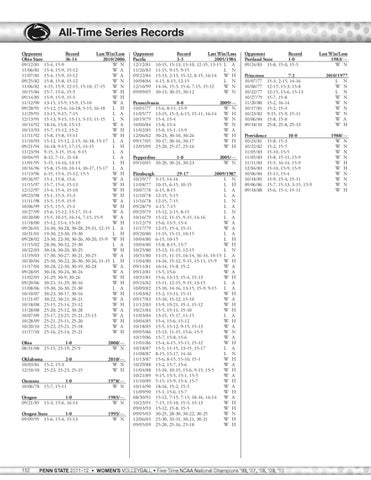 All-Time Series Records Opponent Record Last Win/Loss Ohio State 36-14 2010/2006 09/12/81 15-4, 15-9 W N 11/06/81 15-4, 15-9, 15-12 W A 11/07/81 15-4, 15-9, 15-12 W A 09/25/82 15-8, 15-8, 15-12 W N 11/06/82 4-15, 15-9, 12-15, 15-10, 17-15 W N 10/15/84 15-7, 15-6, 15-5 W H 09/14/85 15-9, 15-9, 15-5 W H 11/12/90 13-15, 15-9, 15-9, 15-10 W A 09/28/91 15-12, 15-6, 16-18, 5-15, 16-18 L H 11/29/91 13-15, 9-15, 7-15 L A 12/13/91 15-13, 9-15, 15-11, 5-15, 11-15 L N 10/14/92 18-16, 15-8, 15-13 W A 10/13/93 15-7, 15-12, 15-2 W H 11/11/92 15-8, 15-8, 15-11 W H 11/10/93 15-12, 15-12, 2-15, 16-18, 15-17 L A 09/21/94 16-18, 9-15, 17-15, 13-15 L H 11/23/94 9-15, 3-15, 15-4, 9-15 L A 10/04/95 8-12, 7-11, 21-18 L A 11/01/95 5-15, 14-16, 13-15 L H 10/16/96 15-8, 15-10, 10-14, 10-17, 15-17 L A 11/13/96 6-15, 15-4, 15-12, 15-5 W H 09/26/97 15-1, 15-8, 15-6 W A 11/15/97 15-7, 15-4, 15-13 W H 12/12/97 15-4, 15-4, 15-10 W H 09/23/98 15-1, 15-3, 15-3 W H 11/11/98 15-5, 15-9, 15-9 W A 10/06/99 15-5, 15-5, 15-1 W H 10/27/99 15-6, 15-12, 15-17, 15-4 W A 10/20/00 15-5, 10-15, 16-14, 7-15, 15-9 W A 11/18/00 15-12, 15-4, 15-10 W H 09/26/01 24-30, 30-28, 30-28, 29-31, 12-15 L A 10/31/01 19-30, 23-30, 19-30 L H 09/28/02 23-30, 22-30, 30-26, 30-20, 15-9 W H 11/15/02 28-30, 30-32, 25-30 L A 10/22/03 30-18, 30-20, 30-25 W H 11/19/03 17-30, 30-27, 30-21, 30-25 W A 10/20/04 25-30, 30-22, 26-30, 30-26, 11-15 L H 11/17/04 30-28, 22-30, 30-19, 30-28 W A 09/28/05 30-18, 30-24, 30-24 W A 11/02/05 31-29, 30-9, 30-26 W H 09/20/06 30-21, 31-29, 30-16 W H 11/08/06 19-30, 26-30, 21-30 L A 10/10/07 30-23, 30-17, 30-16 W H 11/21/07 30-22, 30-21, 30-21 W A 10/18/08 25-15, 25-14, 25-12 W H 11/28/08 25-20, 25-12, 30-28 W A 10/07/09 25-17, 23-25, 25-21, 25-13 W A 10/28/09 25-21, 25-11, 25-20 W H 10/20/10 25-22, 25-21, 25-18 W A 11/17/10 25-16, 25-14, 25-21 W H Ohio 1-0 2008/— 08/31/08 25-15, 25-19, 25-9 W N Oklahoma 2-0 10/03/81 15-2, 15-3 12/10/10 25-23, 25-23, 25-15