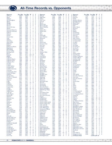 Opponent First Mtg. Last Mtg. W L T Harvard 1909 1932 0 2 0 High Point 2008 2008 1 2 0 Hofstra 2010 2010 3 1 0 Holy Cross 1912 1952 0 7 0 Howard 1977 1981 4 2 0 Illinois 1992 2012 28 25 0 Illinois State 2003 2003 1 0 0 Illinois-Chicago 1992 1992 1 0 0 Illinois Wesleyan 1940 1940 1 0 0 Indiana 1992 2012 39 30 0 Indiana (Pa.) 1900 1990 32 9 0 Indiana State 1966 2001 2 2 0 Iowa 1994 2012 36 27 0 Ithaca 1951 1974 11 7 0 Jacksonville 1993 2006 2 1 0 James Madison 1987 2005 12 11 0 Johnstown 1896 1896 0 1 0 Juniata 1914 1987 31 6 1 Kansas 2007 2007 0 1 0 Kansas State 1994 2007 1 3 0 Kennesaw State 2008 2008 1 0 0 Kent State 2007 2012 6 4 0 Kentucky 1989 1989 1 2 0 Lafayette 1899 1990 23 23 2 Lamar 2010 2010 0 2 0 La Salle 1990 2010 8 3 0 Lebanon Valley 1906 1935 9 1 0 Lehigh 1901 2009 34 6 2 Le Moyne 2011 2011 2 1 0 Lock Haven 1882 1991 12 3 0 Long Island 1941 2000 4 0 0 Maine 1976 1993 2 2 0 Manhattan 1903 1957 2 2 0 Mansfield 1968 1986 15 4 1 Marietta 1926 1926 1 0 0 Maryland 1919 2012 14 10 0 Massachusetts 1985 1991 1 2 0 McNeese State 2010 2010 1 0 0 Mercersburg 1907 1908 1 1 0 Miami (Fla.) 2004 2008 0 4 0 Miami (Ohio) 1998 1998 1 2 0 Michigan 1909 2012 47 38 0 Michigan State 1920 2012 31 40 0 Middlebury 1917 1917 0 1 0 Milesburg 1875 1875 0 1 0 Millersville 1990 1990 2 0 0 Minnesota 1992 2012 23 36 0 Mississippi State 2012 2012 0 2 0 Missouri 1952 1952 0 1 0 Monmouth 2005 2008 1 1 0 Morningside 1983 1985 4 0 0 Mount St. Mary’s 1897 2012 5 3 1 Mount Washington 1909 1909 1 0 0 Muhlenberg College 1929 1948 16 1 0 Navy 1903 2002 33 34 1 New Mexico State 1986 1986 2 0 0 New York Tech 1988 2009 7 2 0 New York University 1921 1956 1 1 0 Niagara 2011 2011 1 0 0 Nicholls State 1990 1990 0 1 0 Norfolk State 1986 2011 19 2 1 North Carolina 1913 2007 6 7 0 North Carolina A&M 1912 1916 2 2 0 North Carolina State 1924 2011 4 2 0 UNC Asheville 2003 2003 0 1 0 UNC Greensboro 2012 2012 0 3 0 UNC Wilmington 1997 2005 1 1 0 Northeastern Illinois 1997 1997 2 0 0 Northwestern 1992 2011 36 35 0 Notre Dame 1909 2011 3 10 0 Oglethorpe 1923 1923 2 0 0 Ohio State 1958 2012 34 54 0 Oklahoma 1973 1985 0 3 0 Oklahoma State 1959 1983 0 3 0 Old Dominion 1988 2011 5 7 0 Olmsted Field 1946 1946 1 0 0 Oral Roberts 2007 2007 0 3 0 Pace 2001 2001 2 1 0 Pacific 1996 1996 0 1 0 Pennsylvania 1894 2003 21 18 0 Pennsylvania MC 1901 1901 1 0 0 PRR of Philadelphia 1889 1889 1 0 0 PRR (YMCA) 1900 1901 1 1 0 Philipsburg 1889 1889 1 0 0 Pittsburgh 1912 2012 83 41 1 Pittsburgh Collegians 1920 1923 4 0 0 Pittsburgh Pirates 1924 1924 0 1 0