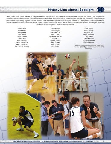 Nittany Lion Alumni Spotlight Head coach Mark Pavlik, as well as his predecessors Tom Tait and Tom Peterson, have produced many of the nation’s top players during their time at the helm of the Penn State program. However, the successes of the Penn State players and staff don’t stop once they graduate or move away. A great number not only have successful professional volleyball careers, but also pursue coaching careers at high schools, clubs and universities across the country and around the world. Below are the names of former staff and players who have entered the coaching ranks after time at Penn State. Steve Aird Chris Birch Larry Bock Neal Brown Javier Gaspar Dan Gwitt John Hartranft Jason Hawkins Brian Heffernan Ramon Hernandez