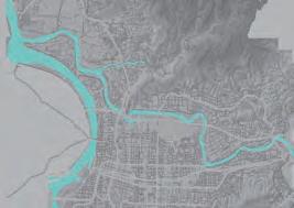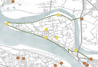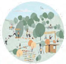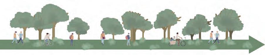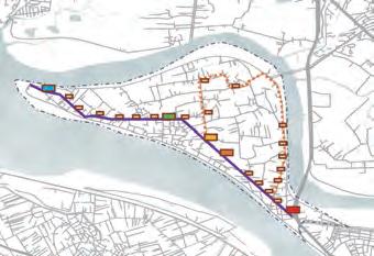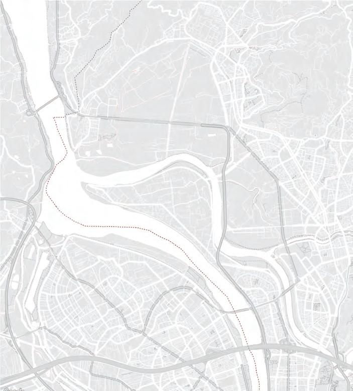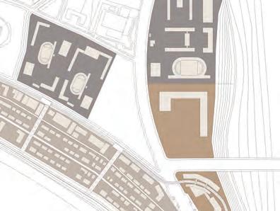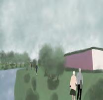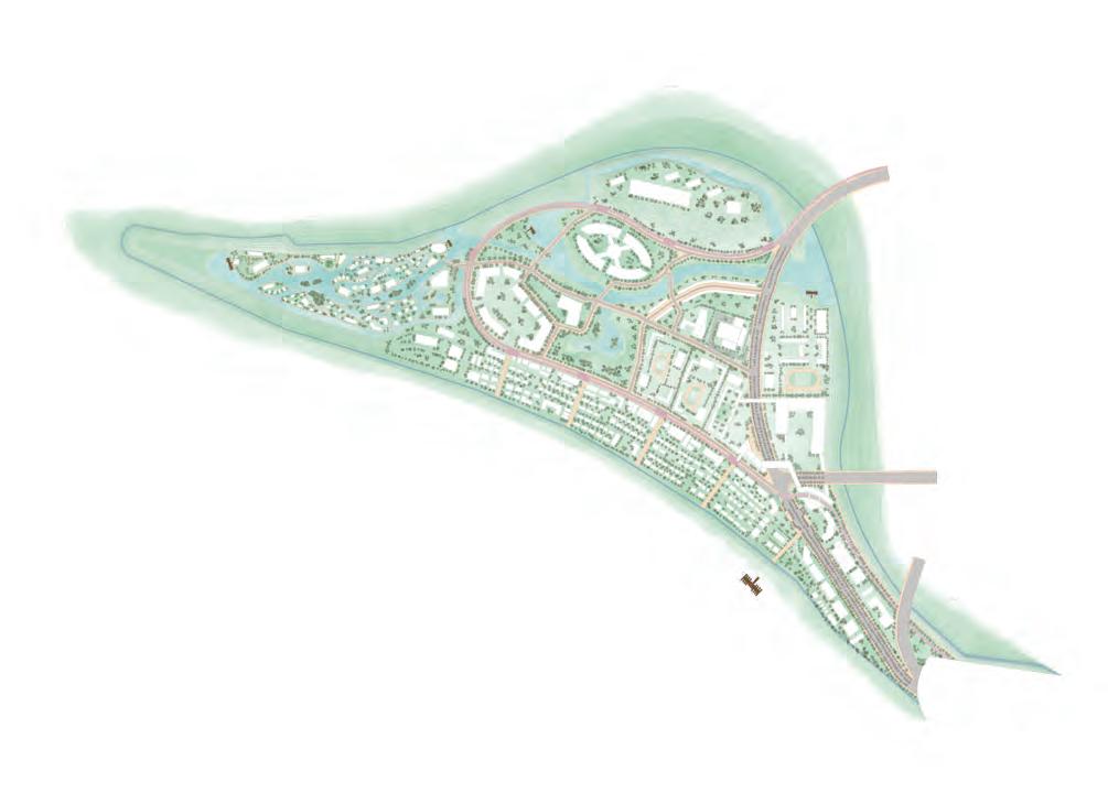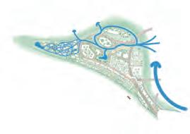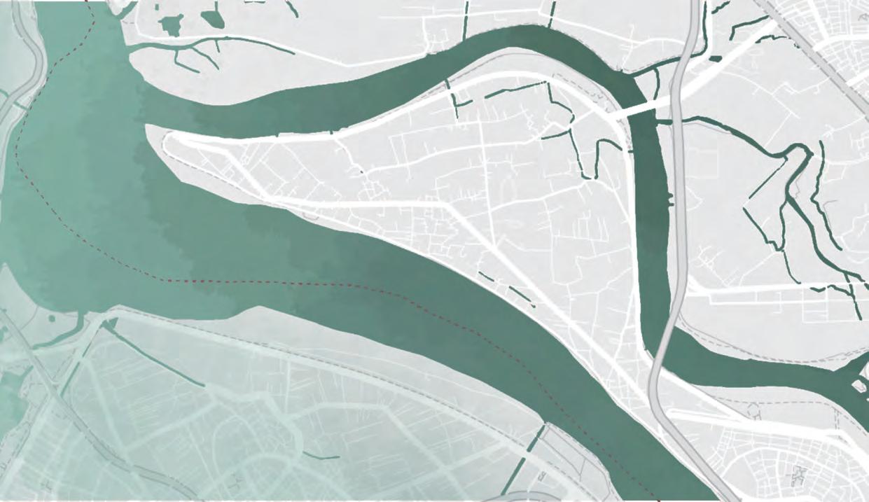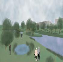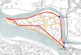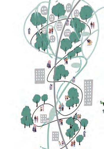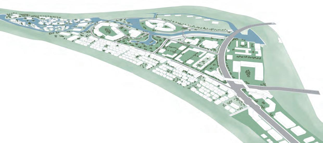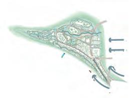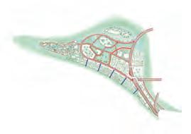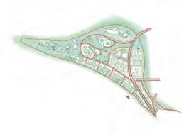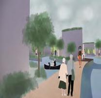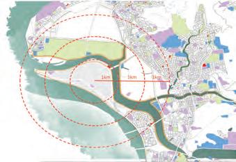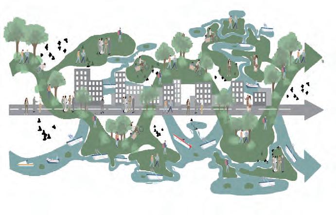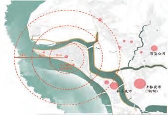 以步行悠活與生態綠帶為主軸,將社子島定義為人與生態互動 的生態綠洲,探討都市與自然環境間的可能性,以中央水道打 破兩區的分界,塑造水道樂活的空間氛圍。