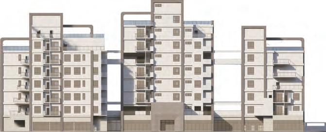 低樓層利用棟別將青壯年與年長者分開,左右兩棟為青壯年區,中間棟為年長者區 ,年長者的棟別在基地做較多的退縮,加上植栽的規劃,去阻擋主要道路造成的噪 音汙染。