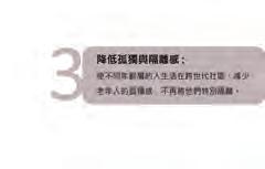 解決子女與年長者不同住,卻又能保有良好的家庭關係。 打破老人公寓與住宅框架,與跨世代族群交流,降低孤獨與隔離感。 滿足不同的家庭結構,豐富社區的多元性。 提供安全舒適的居住環境,滿足各族群的需求。