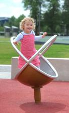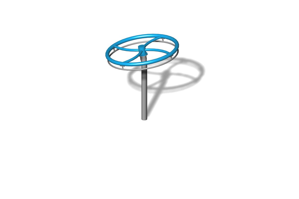 There is endless fun here, especially for older children who have the upper body strength needed to hold on while turning. Children will learn about centrifugal forces by experiencing the slant of the ring. Starting from the top, the child will glide down with just enough force to make their way to the top again. The upper ring and post are Sky Blue (RAL 5015).