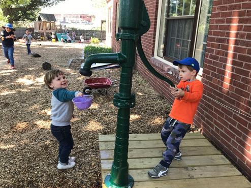 “Farm style” water pump. The pump is completely enclosed and has no pinch points. Water will only flow when the handle is moved.