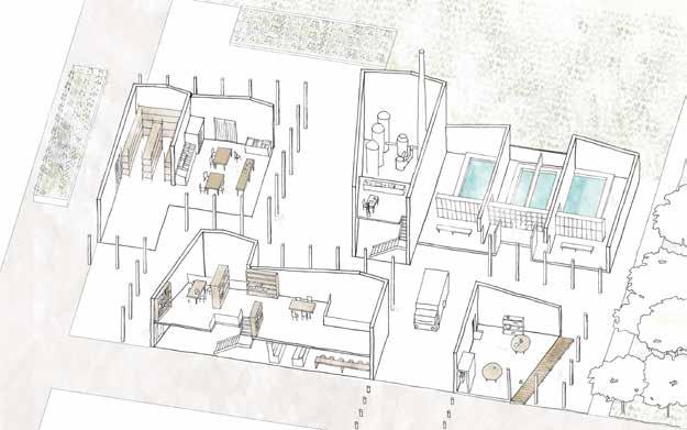 Nuestra propuesta se centró en la gestión de los residuos, puesto que, desgraciadamente, hoy en día, todas las personas generamos demasiada. Teniendo en cuenta este concepto, creamos diferentes espacios para estos espacios residenciales, en los que los residuos cotidianos se utilizan para crear espacios beneficiosos para el barrio, creando así una comunidad.