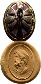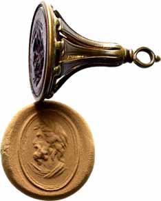 1588 Petschaft AE Siegel 1. Hälfte 19. Jahrhundert oder später. Rote Glaspaste mit Philosophenbüste in (ehemals vergoldeter) Messingfassung. Gemme ca. 25 x 18 mm, Höhe der Fassung ca. 36 mm. 11,40 g. Fassung im Empire-Stil. Intakt 80,–