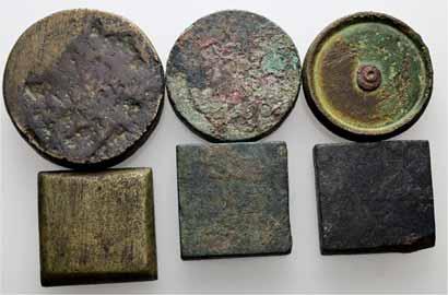 1586 Petschaft AE Siegel 16./17. Jahrhundert, wohl Deutschland. + S.[igulum] ROBERTI. DE ROTH, Wappenschild mit Umschrift. Buntmetallguss. Kleine, gelochte Handhabe. Durchmesser ca. 23, Höhe ca. 19 mm. 17,39 g. Dunkle Patina, intakt 120,–