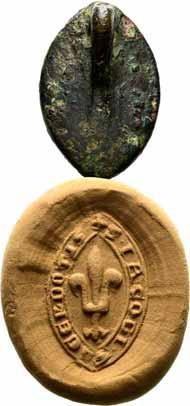 1584 Petschaft AE Gotisches Siegel 14./15. Jahrhundert, wohl Europa. S.[igulum] IACOBI - ACERDOTIS, heraldische Lilie. Bronzeguss, spitzoval 35 x 24 mm. Rückseitig oben Trageöse. 17,86 g. Dunkle Patina, intakt 150,–