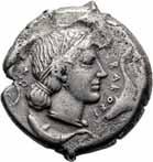 14 2. Republik, 466 - 406 v. Chr. AE Hemilitron ø 17mm (5,13g). ca. 405 - 375 v. Chr. Vs.: Kopf der Arethusa n. l., dahinter E. Rs.: Viergeteiltes Quadratum incusum, im Zentrum achtstrahliger Stern. CNS II S. 39 Nr. 16; SNG München 1097; SNG Cop. 695; HGC 2, 1481. Dunkelgrüne Patina, ss 60,–Erworben 1979 bei Peus, Frankfurt.Das E auf dem Avers könnte als Künstlersignatur des Euainetos interpretiert werden.