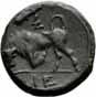 Hieron II., 274 - 215 v. Chr. AE ø 17mm (3,73g). ca. 275 - 269/65 v. Chr. Vs.: ΣΥΡΑΚΟΣΙΩΝ, Kopf der Kore-Persephone mit Ährenkranz n. l., hinter dem Kopf Mohnkapsel. Rs.: Stier auf Standlinie n. l. stoßend, darüber Keule u. Σ , im Abschnitt IE. SNG ANS 595; CNS II S. 351, Emission 192, Rl 18; HGC 2, 1497. Herrliche grüne Patina, vz 100,–