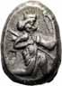 53 Satrap Orontas, 357 - 352 v. Chr. Obol ø 8mm (0,53g). Vs.: Kopf der Athena mit attischem Helm n. r. Rs.: [OP]ONTA (retrograd), Pegasosprotome n. l. Plankenhorn S. 11 Nr. 5 (dieses Exemplar!) RR! Nicht in den großen Referenzsammlungen! Dunkler Hornsilberbelag, ss 50,–