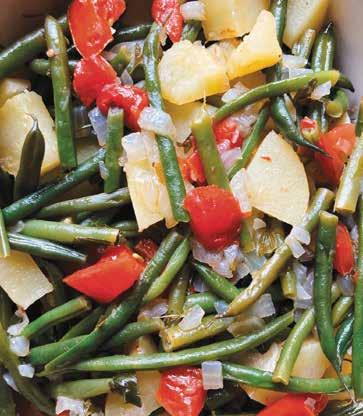 In a medium pot, heat olive oil on low to medium heat. Sauté onion until softened. Add potatoes and heat for 2 to 3 minutes. Add beans and mix with olive oil until coated. Add tomatoes, parsley, sugar, salt and pepper. Mix well. Add just enough hot water to cover the beans halfway. Cover and simmer for about 40 minutes, or until beans are soft and most of the liquid is absorbed. May be served as a side dish for four people or a vegetarian/vegan entrée for two. Courtesy of Elena Paravantes, RDN. For more information and Mediterranean recipes, visit OliveTomato.com.