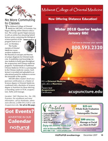 he Midwest College of Oriental Medicine (MCOM), in Evanston, has begun offering online distance education. The winter quarter begins January 6 with an online live streaming hybrid lecture series containing the biological science portion of the program from 6 to 9 p.m. on Mondays. The Fundamentals of Oriental Medicine course awakens students to the theoretical concepts and theories of unique diagnosis for Oriental medicine. It establishes root knowledge for new students to build upon throughout the acupuncture and Chinese medicine programs. Fundamentals of Traditional Chinese Medicine (TCM) is a prerequisite to the Chinese medicine courses. Each lecture is recorded and uploaded to an educational portal for students to review the remainder of the quarter. MCOM offers master’s level acupuncture certification or a Master of Science degree in Oriental Medicine, combined with a Bachelor of Science degree in Nutrition for those desiring a rewarding career in TCM, acupuncture, herbs and massage.