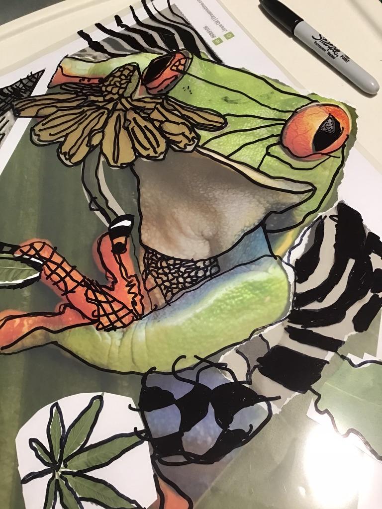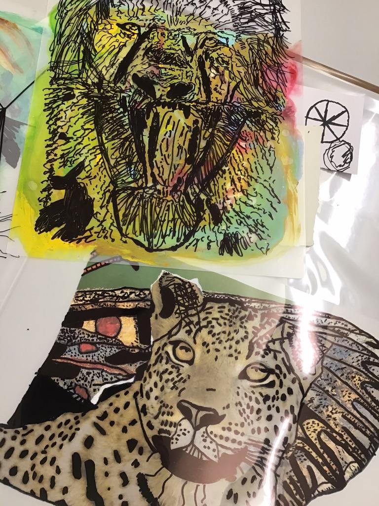 Large images of animals were the focus for developing images inside and on the surface of laminator pouches using Sharpie pens and acrylic paint.