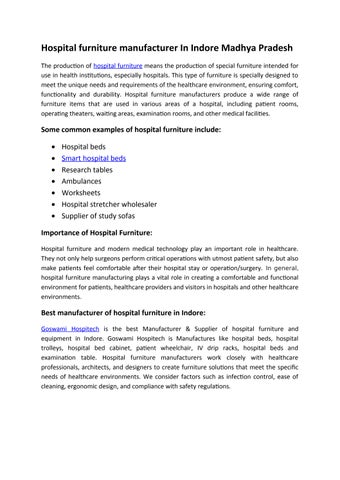 Goswami Hospitalech is the best manufacturer of hospital accessories in Indore. we manufacture Hospital Cots, Hospital Beds, Hospital Trolleys, wheelchairs etc.